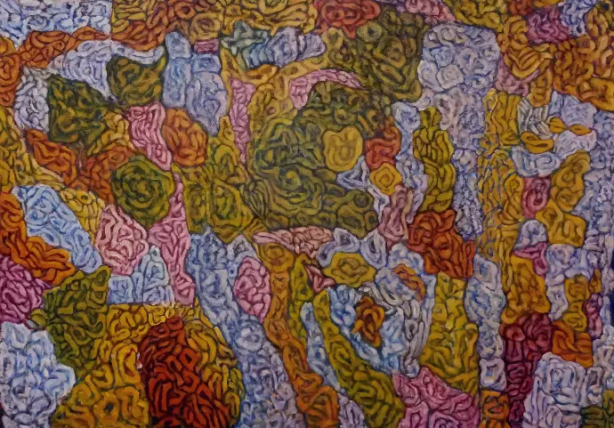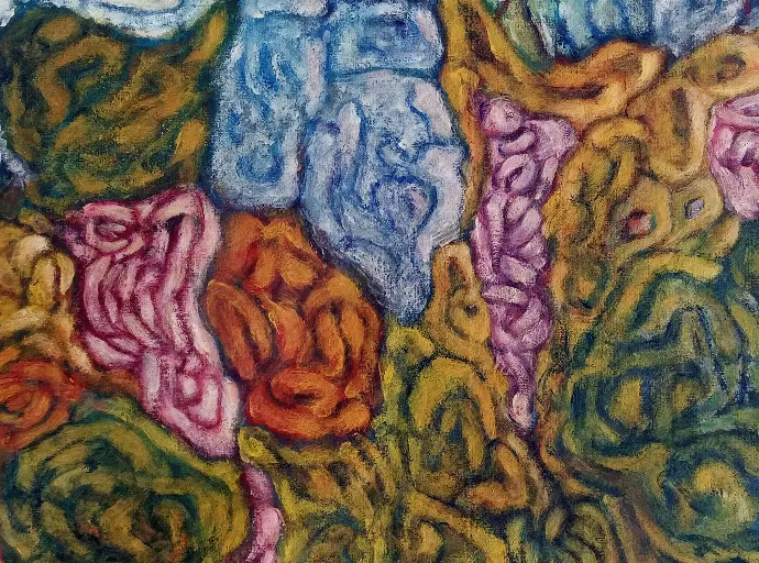 Cette œuvre déploie un réseau organique de formes entrelacées, où la matière semble en perpétuelle mutation. Les couleurs se mêlent dans un flux vibratoire, oscillant entre le végétal et le minéral, entre la chair et la pierre. L’œil se perd et se retrouve dans ce labyrinthe guidé par des nuances tantôt douces, tantôt ardentes.